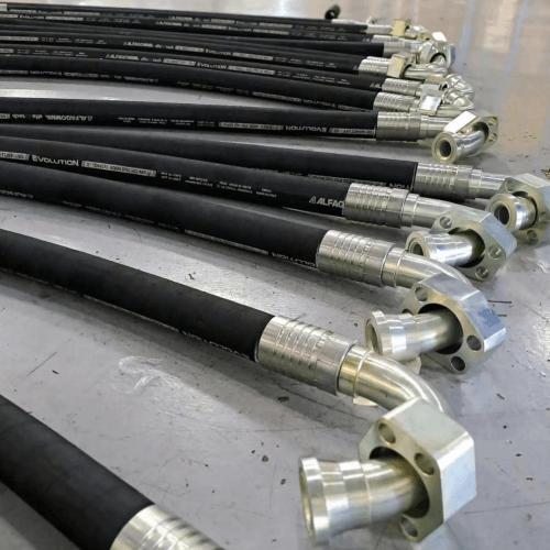 安装前确认存储合规性:Alfagomma阿法格玛橡胶软管应盘卷存放(不得打折),远离臭氧源、紫外线和溶剂,存储温度在-15°C至+25°C之间。超过24个月的存储软管,使用前应重新测试。