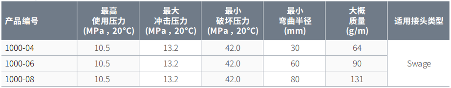 1000/100R 特点: • 外径小 • 轻 适用流体:矿物性一般液压油 使用温度范围 :-40~+100℃ 一箱的包装单位:100m