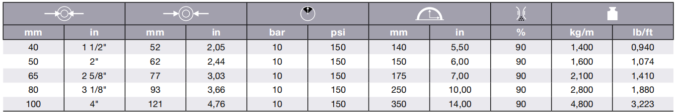 电阻: ≤ 2.5 Ohm/mt (≤DN 50mm (2’’))