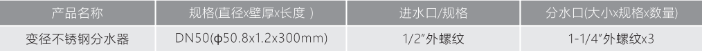 品材质:不锈钢304、316L 产品规格:主水管外径Φ25.4-159(DN25-DN150),进水口为1/2”-6”(DN15-DN150) 分支间距:常见的间距有120mm、150mm、160mm、180mm、200mm 产品用途:广泛应用于自来水水表安装工程、家装工程、直饮水工程、地暖工程、以及其他泵房集成系统工程等