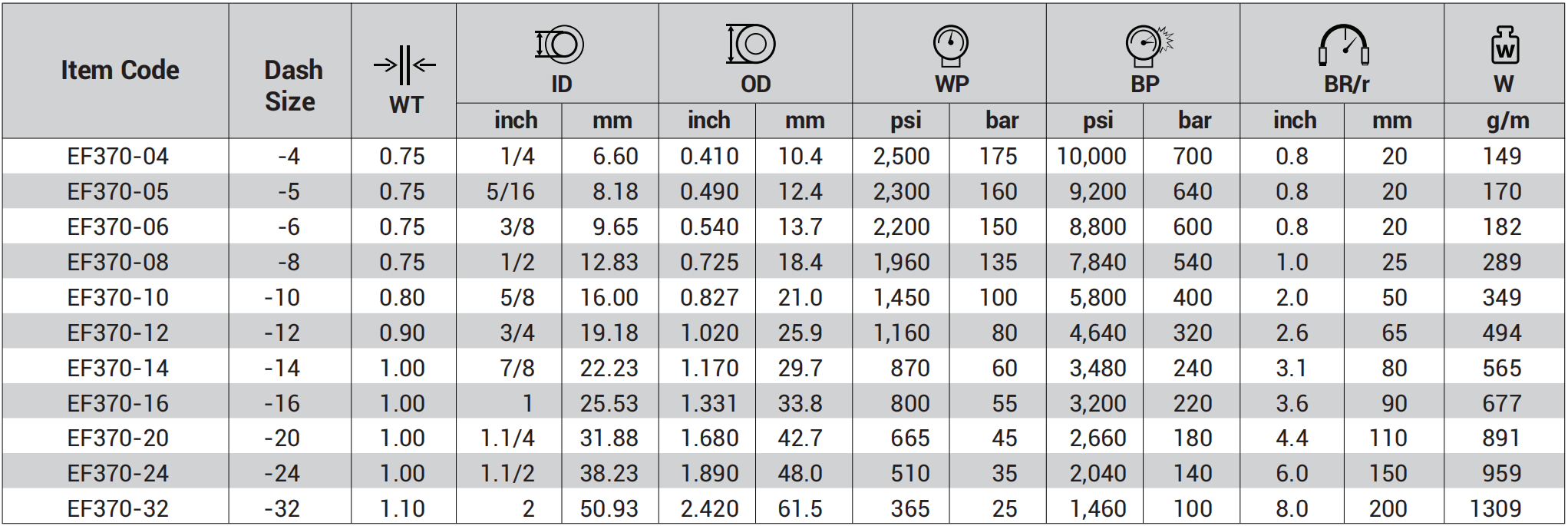EF370 - PTFE - 内壁波纹型应用于汽车、化工、制药、食品加工、塑料和橡胶成型机器上。